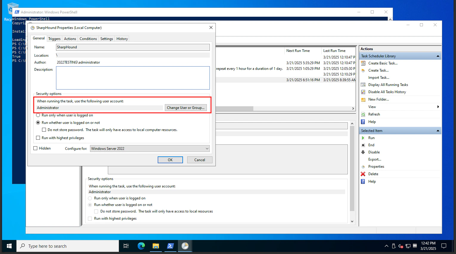 Open the Scheduled Tasks MSC on the SharpHound server and create a scheduled task. In the example shown below, the scheduled task name is SharpHound.