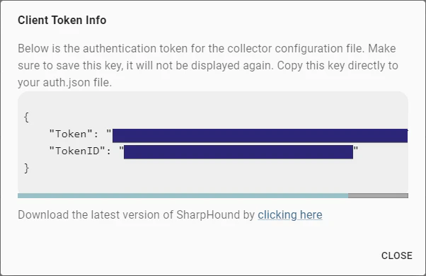 - In the pop-up window, for example named New SharpHound Enterprise Client, input the Client Name and click CREATE