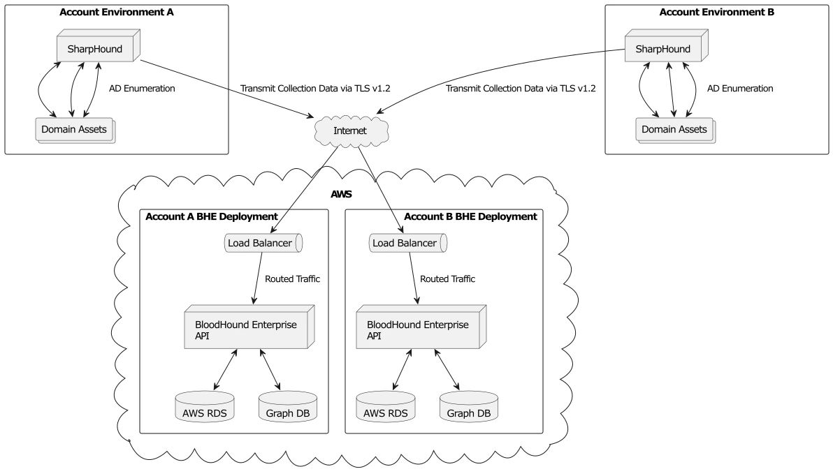 Attack Paths are chains of abusable privileges and user behaviors that create direct and indirect connections between computers and users. They exist due to years of misconfigurations and a lack of visibility into how privileges are applied. Attack Paths cannot be patched through traditional methods because they are misconfigurations, not vulnerabilities. SpecterOps built BloodHound Enterprise following the principles of Attack Path Management (APM). The primary goal of APM is to solve the Attack Path problem directly. APM is a fundamentally different, unique methodology designed to help organizations understand, empirically quantify the impact of, and eliminate Attack Path risks.Single-Tenant Architecture Diagram