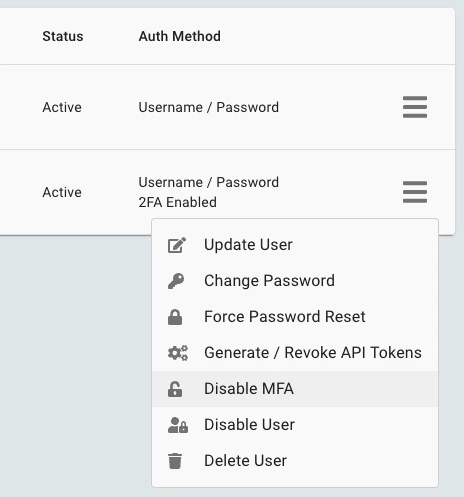 • Administrator management of MFA tokens - Administrators now have an option in the “Manage Users” section of “Administration” to disable MFA tokens on users who have lost access to their devices.