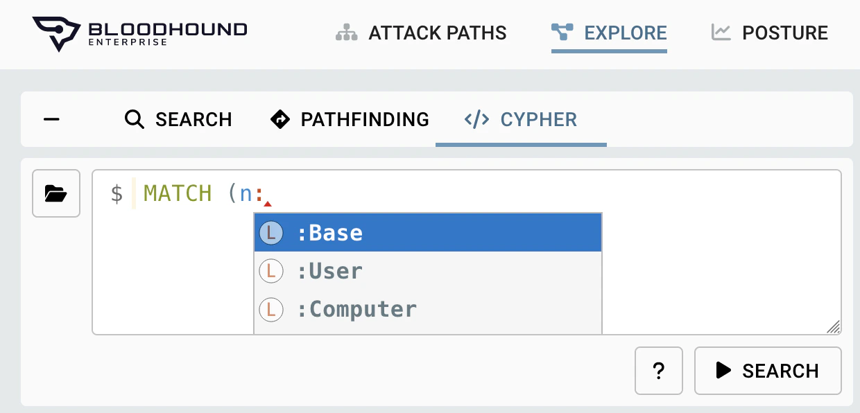 • Cypher syntax highlighting and autocomplete - Writing Cypher got significantly easier with syntax highlighting and autocomplete support. While typing a Cypher query, the editor will now display options to auto-complete in-progress words based on the BloodHound schema and highlight issues directly within the editor.